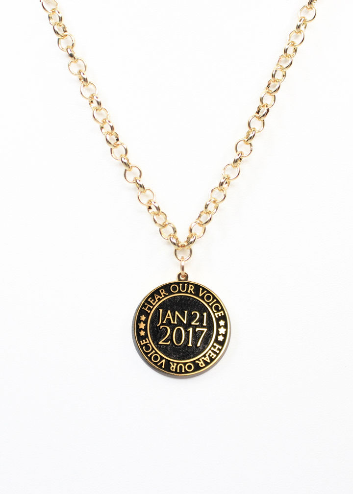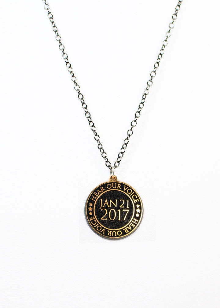The two-sided design features the Women's symbol, and on the opposite side the date of this historic march and the powerful statement, “Hear Our Voice”.